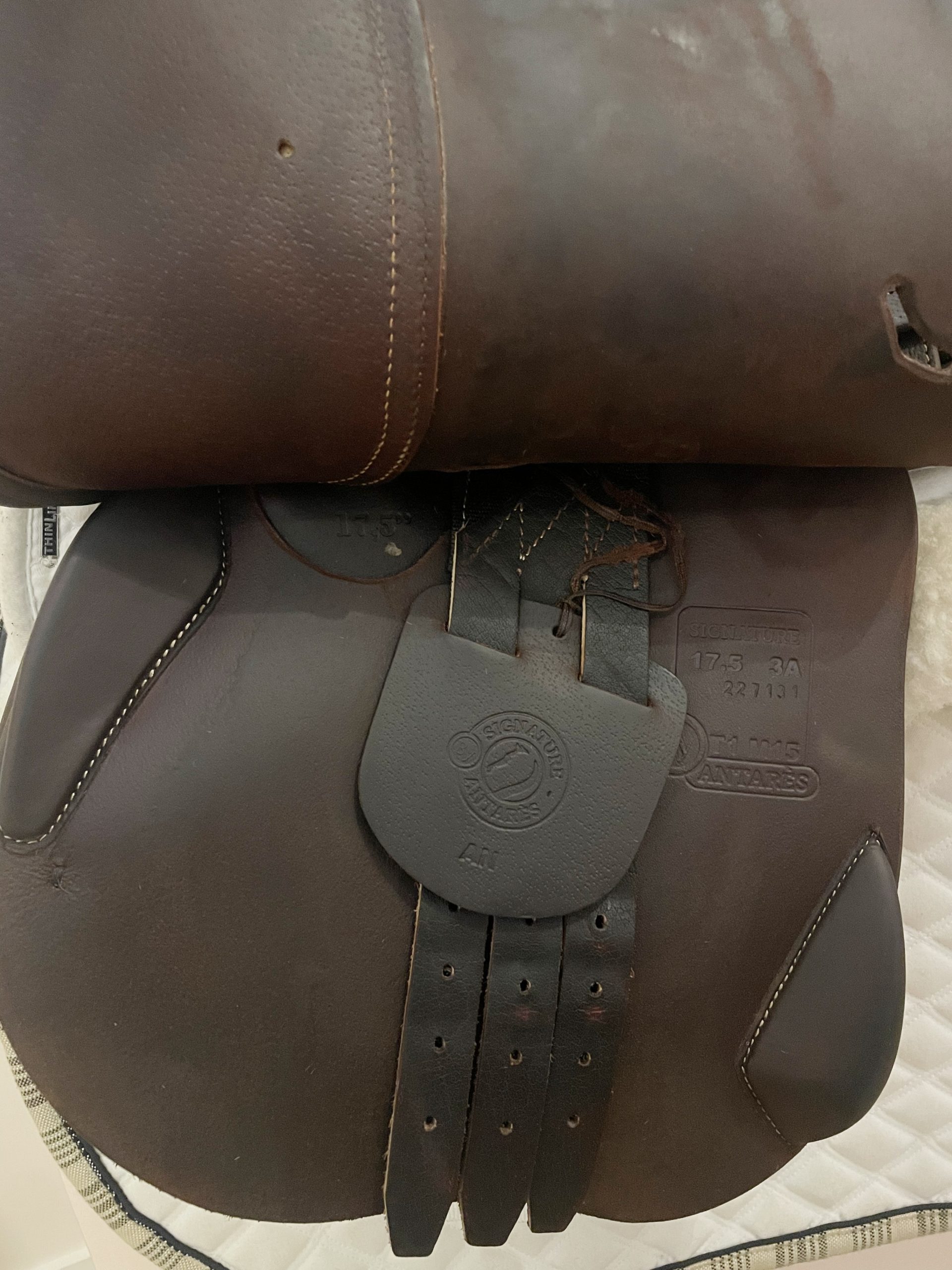 SKU: JS1496 Brand: Antares Model: Signature Seat: 17.5” Flap: 3A (13.75” Long X 14.5” Wide) Tree: 4.25” Dot to Dot Leather: Grain – Calf Condition: Excellent! Price: CAD/ USD (Reasonable Offers May Be Considered)
