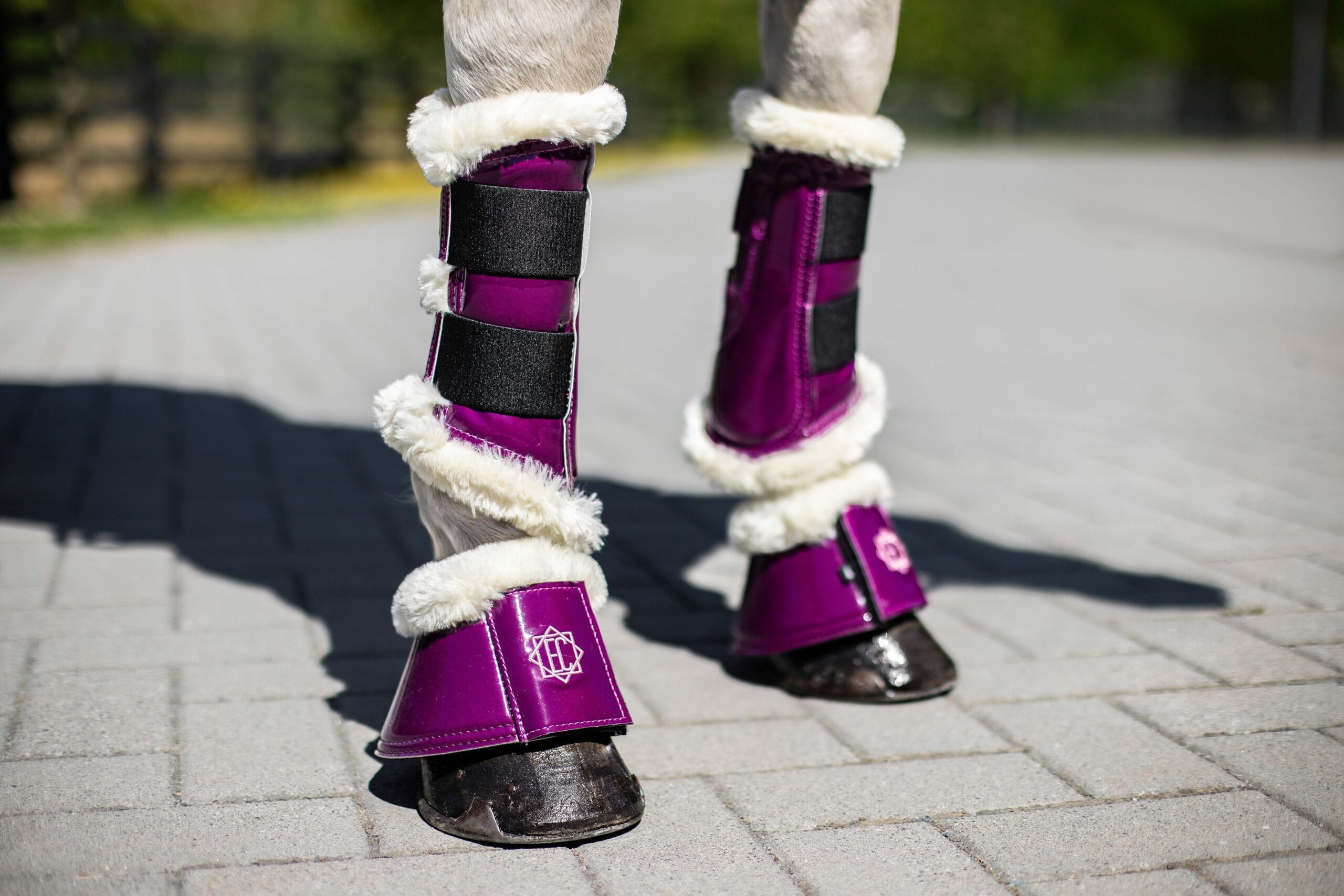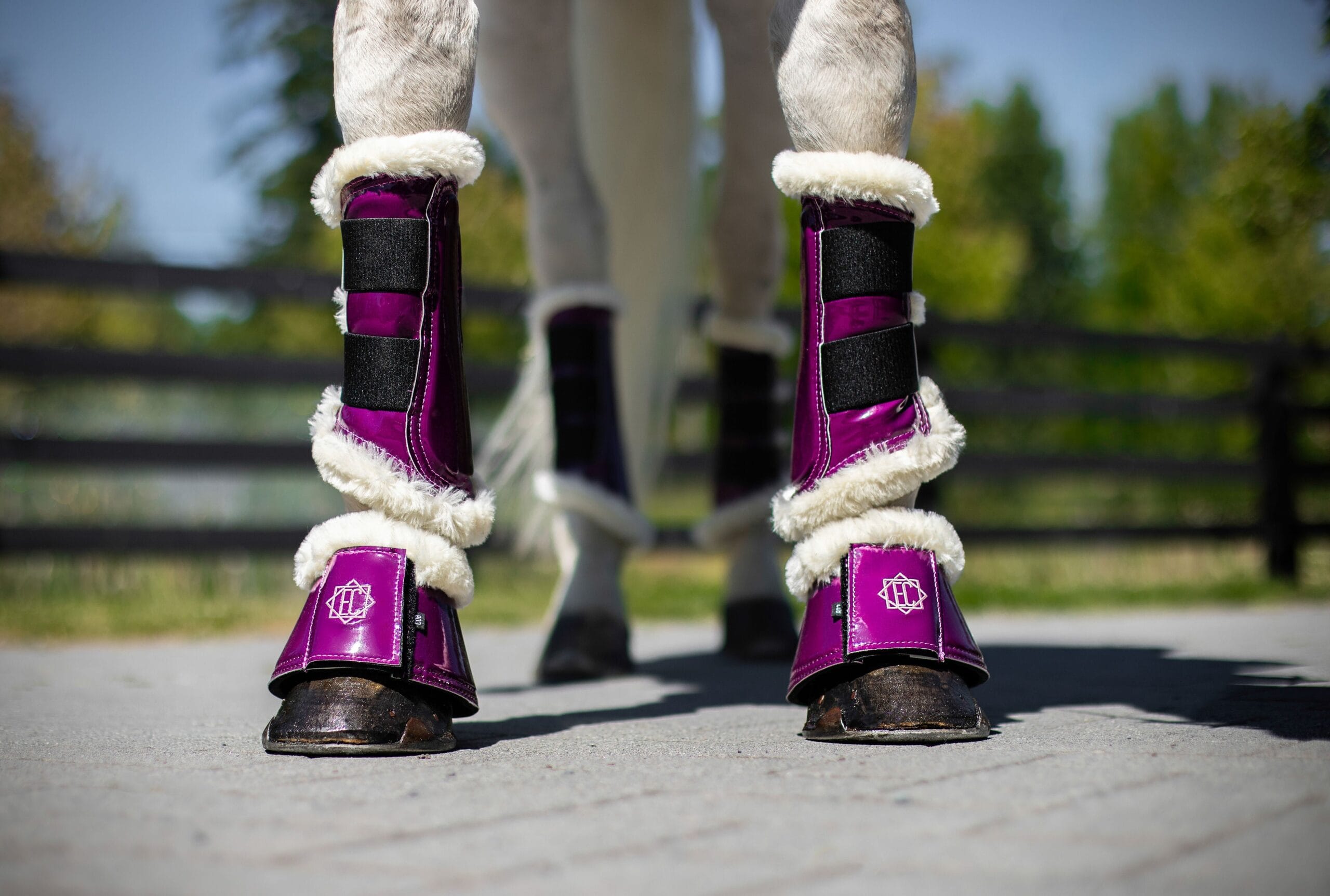 Protection and comfort while looking stylish Shiny patent leather exterior Soft fleece around top rim Neoprene lining on inside Double locking Velcro straps keeps them safely in place Designed in Canada