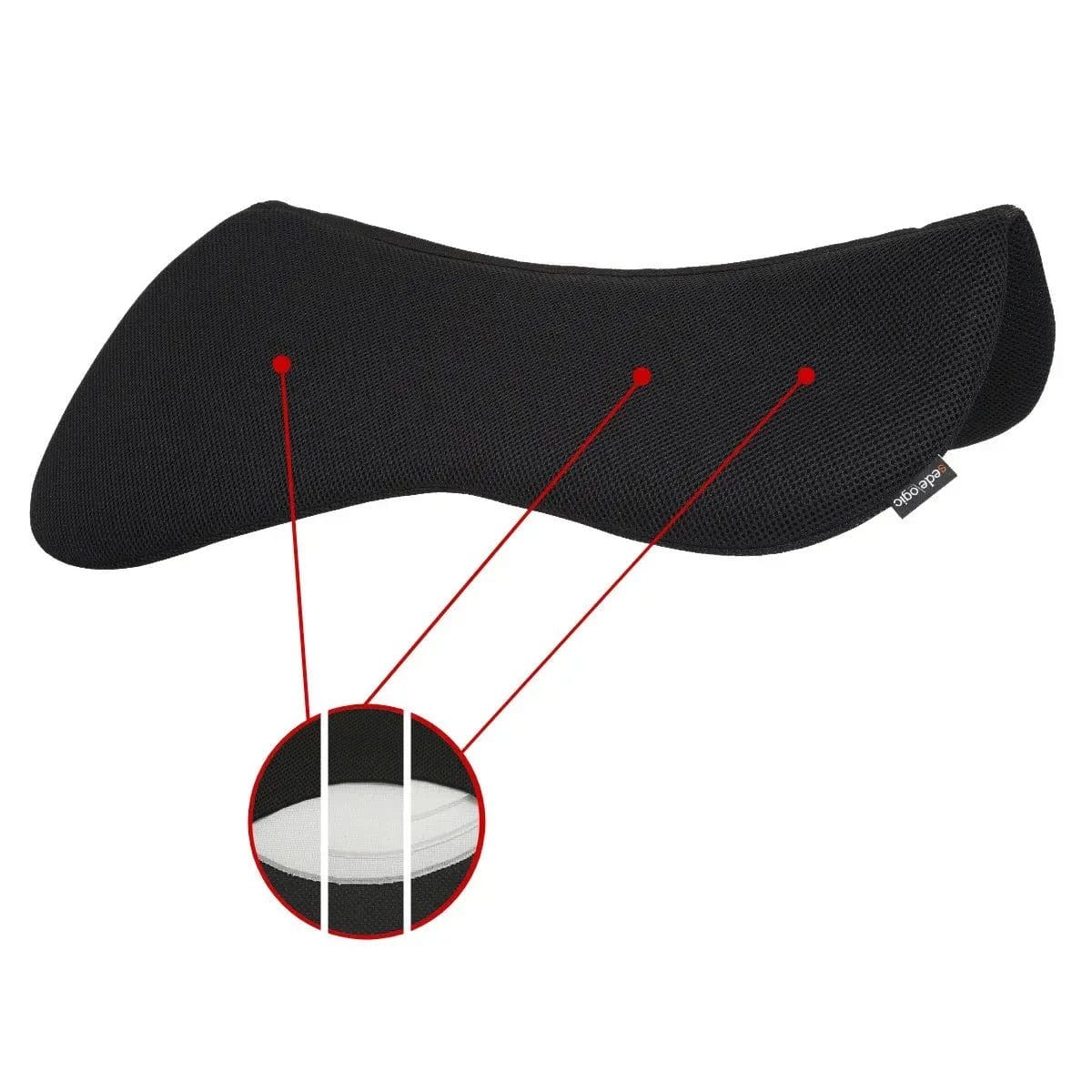 English half pad. Especially good for horses with poorly developed back muscles, difficult saddle fit, sensitive backs. Pressure-relieving, shock absorbing, breathable, washable & quick drying. 3 ply in back, 2 ply in the middle and 1 ply in the front.