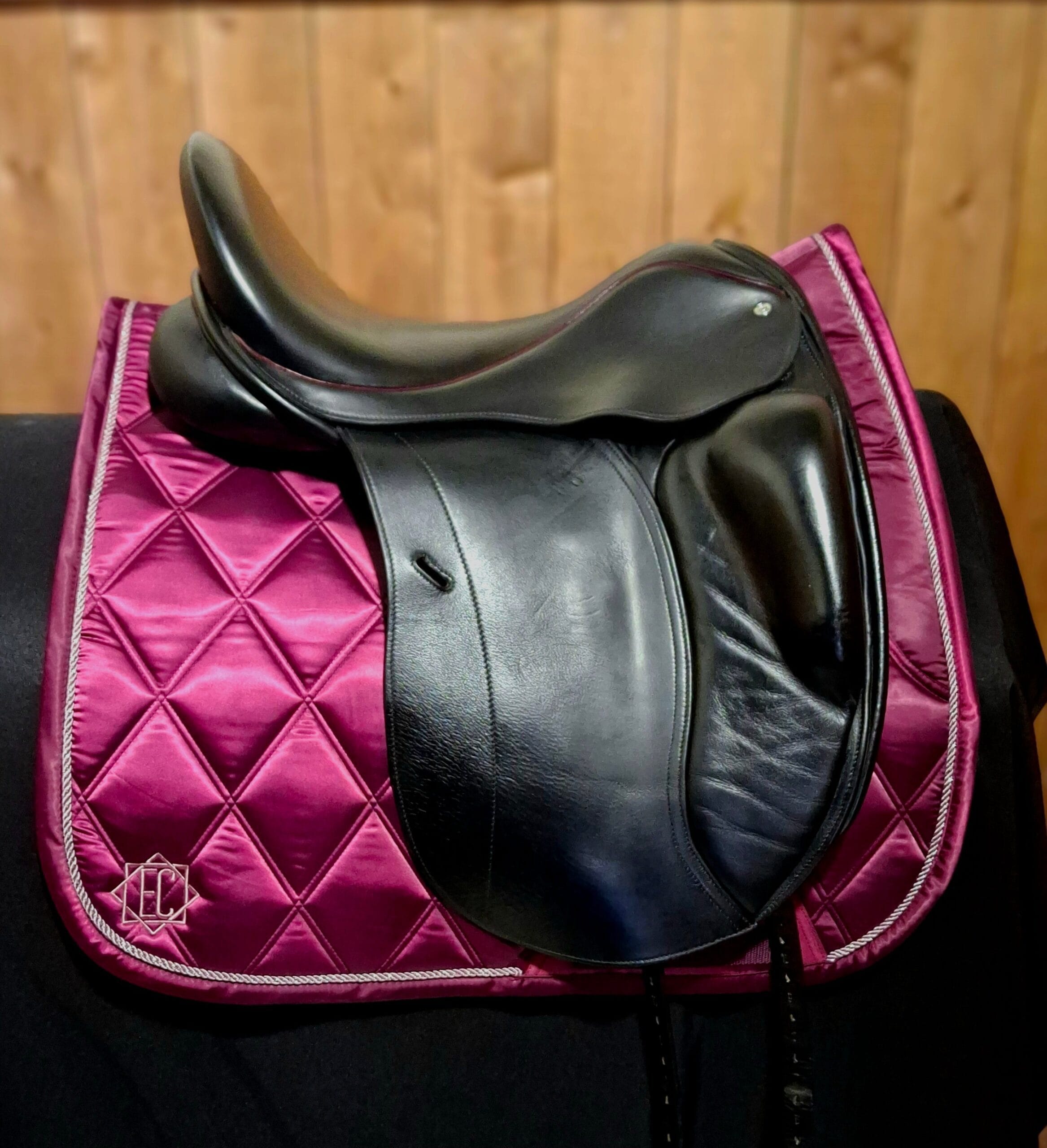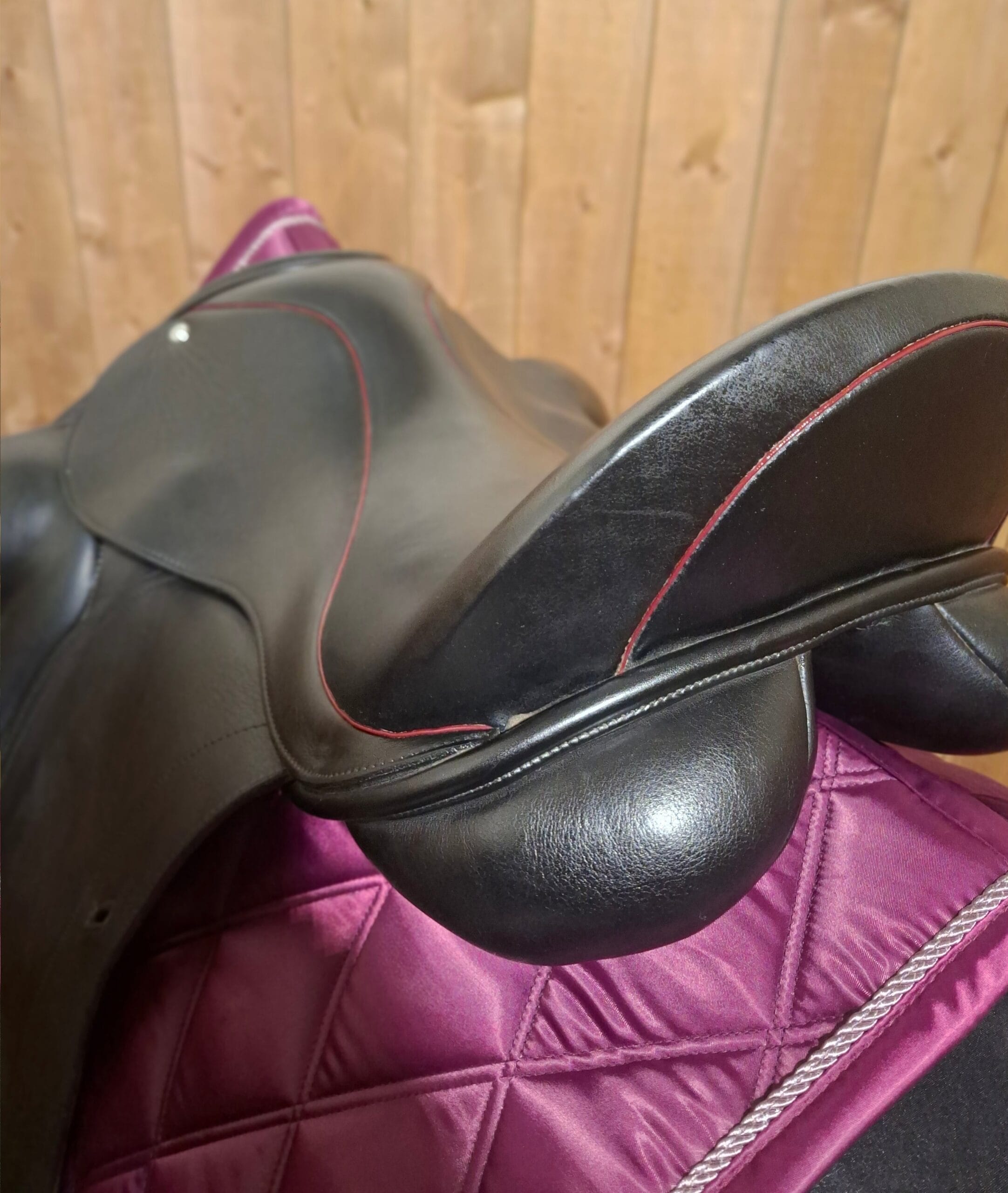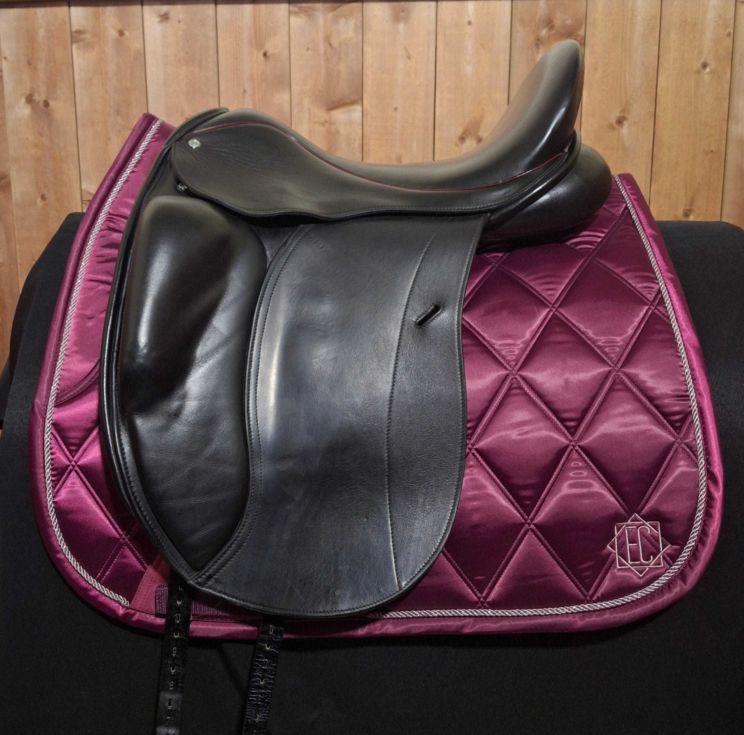 Highly sought after Loxley Mono Dressage Saddle in great condition. The close contact dressage saddle is designed with a fashionable monoflap offering a refined connection for the rider to feel the close contact between horse and leg, with the added benefit of a lighter weight saddle. Deep seated with moulded front block for direct support. Made in the tactile and buttery soft Calf Nappa for suppleness and grip. Features burgundy piping.