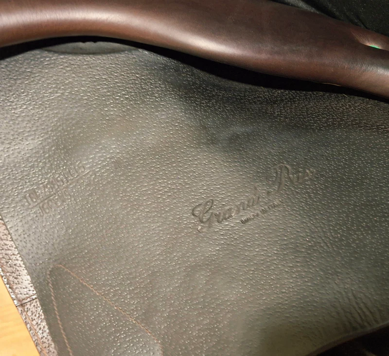 18″ Equipe Grand Prix jump saddle manufactured in 2015, this Italian made saddle features beautiful calf leather in a rich brown color. The Grand Prix is one of Equipe’s most popular models and is designed for a horse with a tall, long wither and a bit of curve to their back. The Grand Prix places the rider perfectly in balance on a horse of this shape, allowing ample wither freedom that is often a struggle to achieve in most modern jumping saddles. The longer flap accommodates a long leg. Twin flap with both thigh and calf blocks. Tree is set to a M+2 so approximately a wide. Also comes with girth buckle guards not shown here.