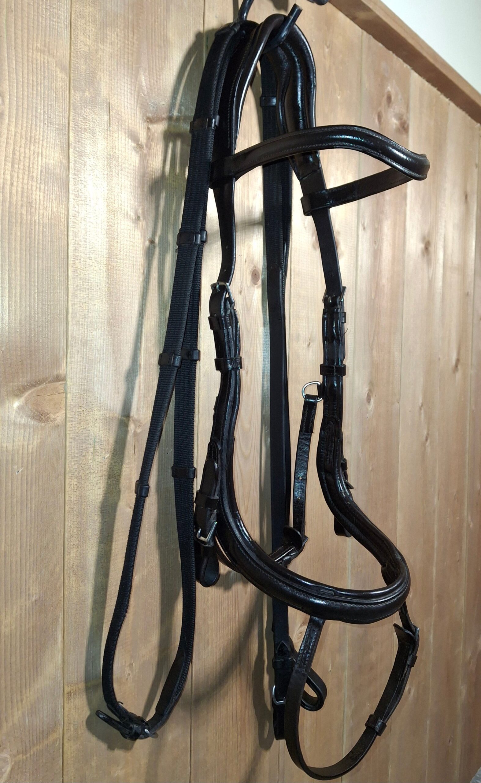 In good used condition, shaped browband, double noseband and padded mono anatomical crown pieces along with a well-placed throat latch for horse comfort. Hard to tell exact color, the reins are definitely black, the bridle might be a very dark brown or black.