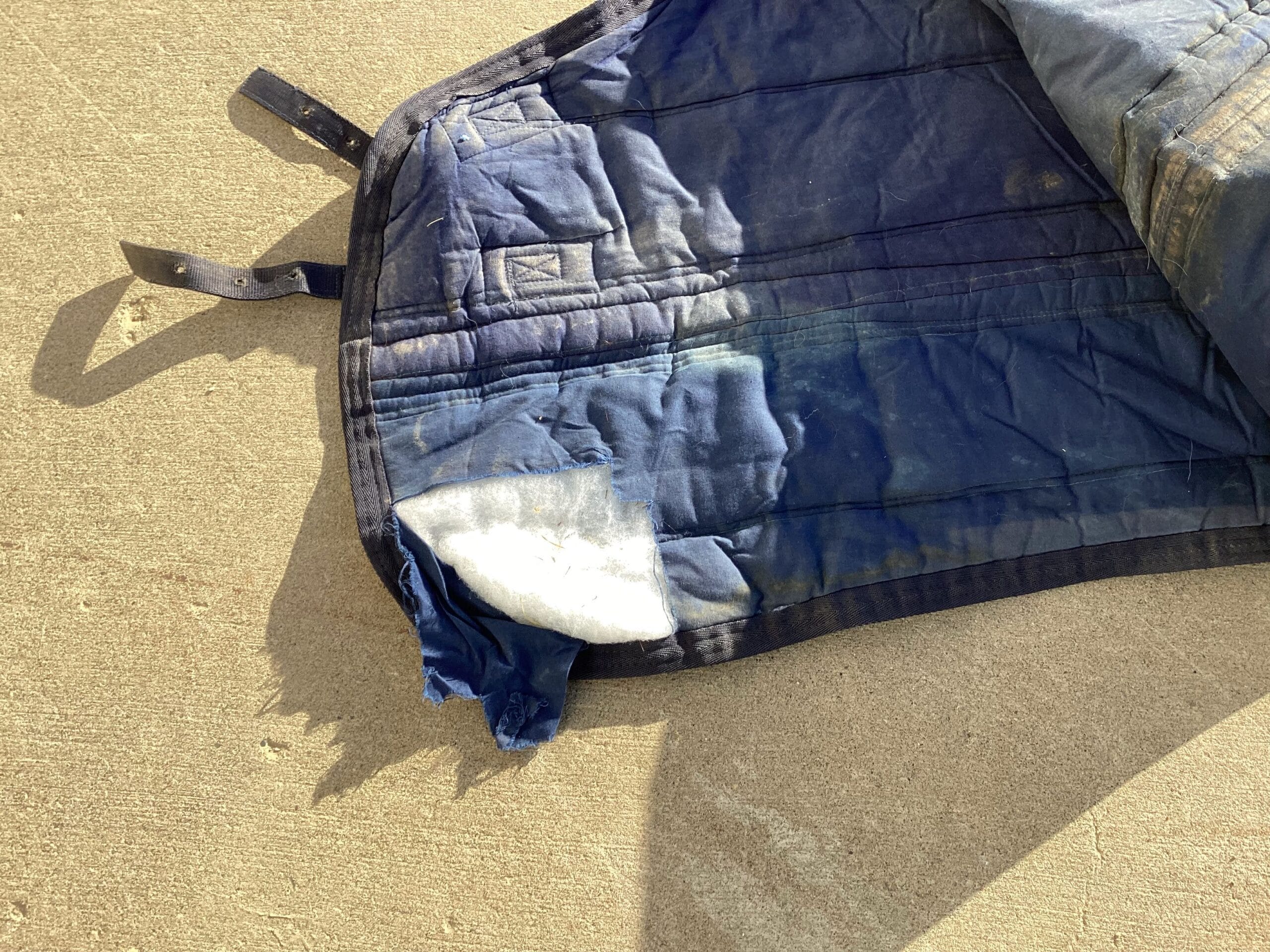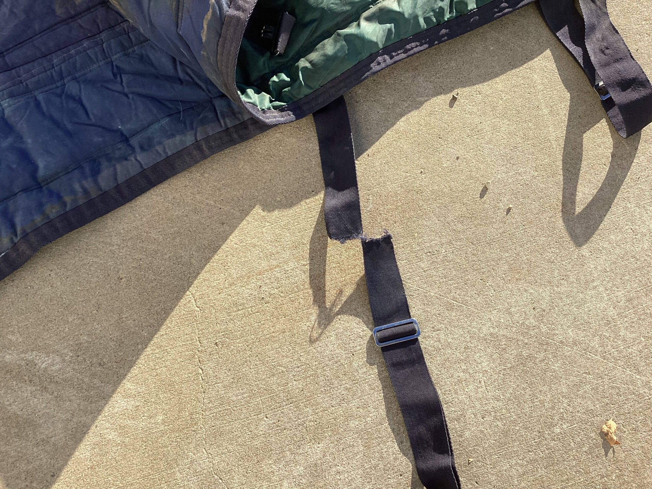 Winter Coat Guess 200G 76″ Green Blue trim Holes inside. no back straps strap torn see pictures